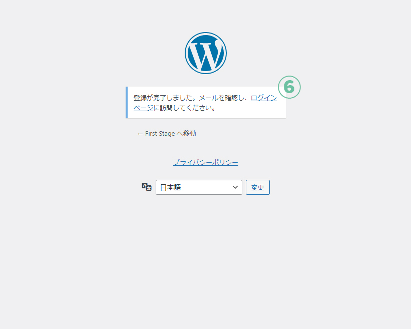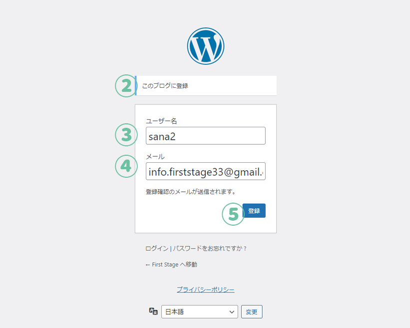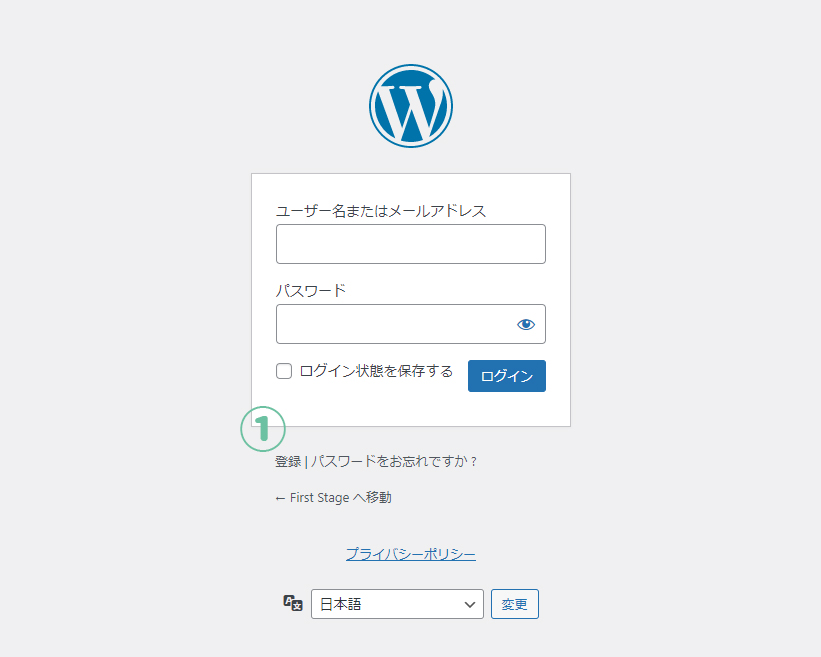 1.Wordpressの画面を表示。①の登録という文字をクリック。