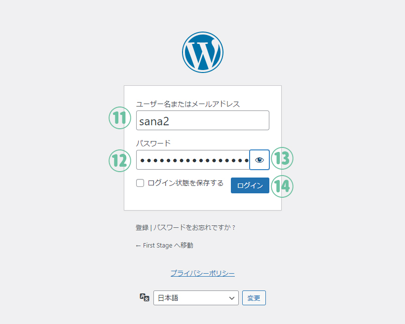 ※ ⑬の目のマークをクリックすると隠されているパスワードが表示されます。